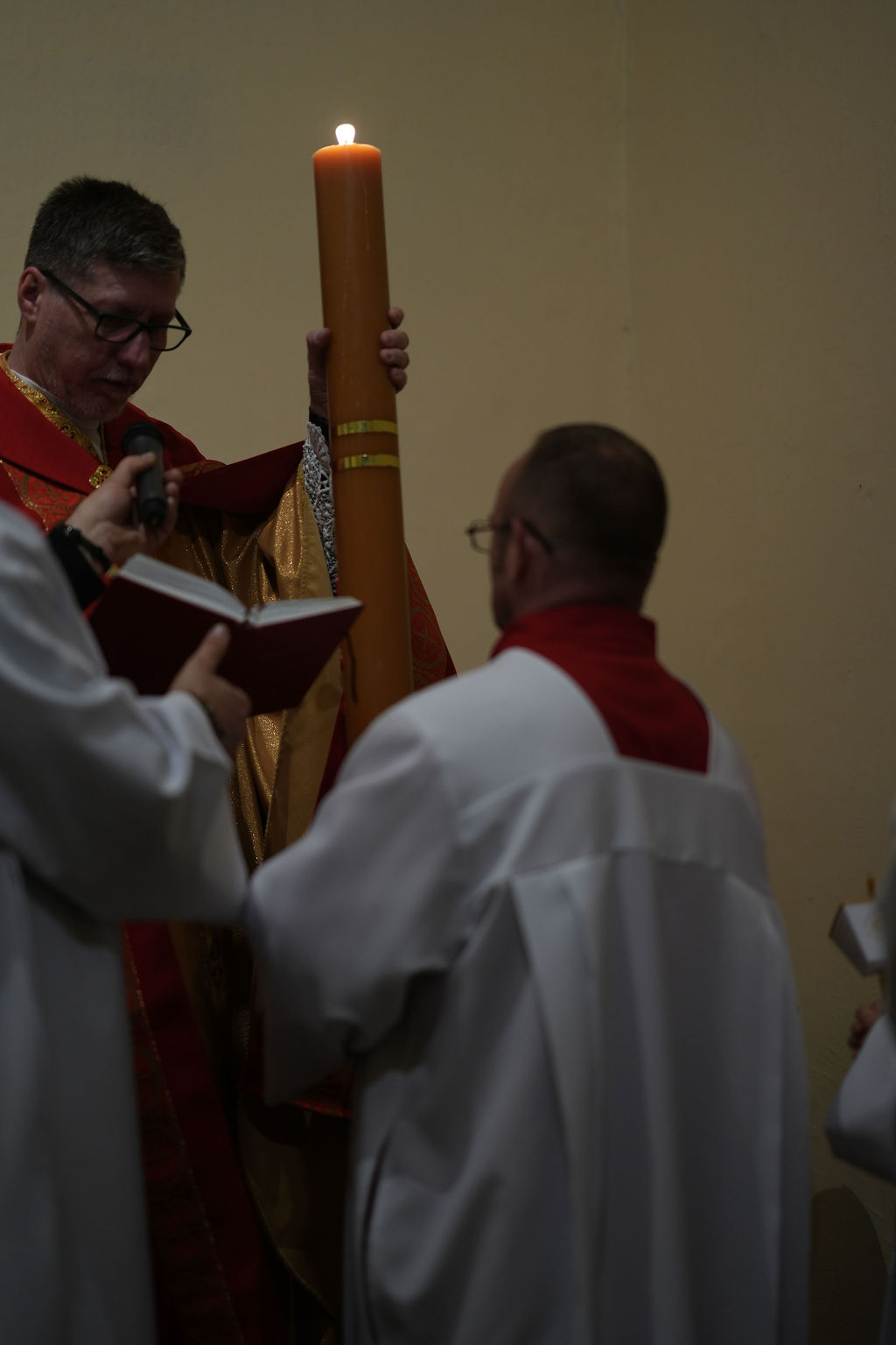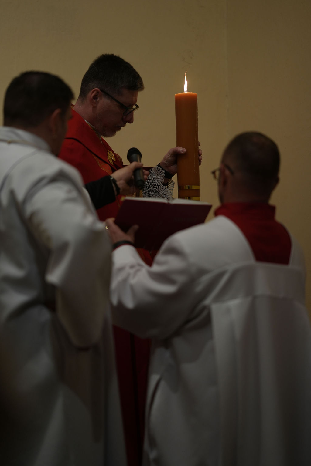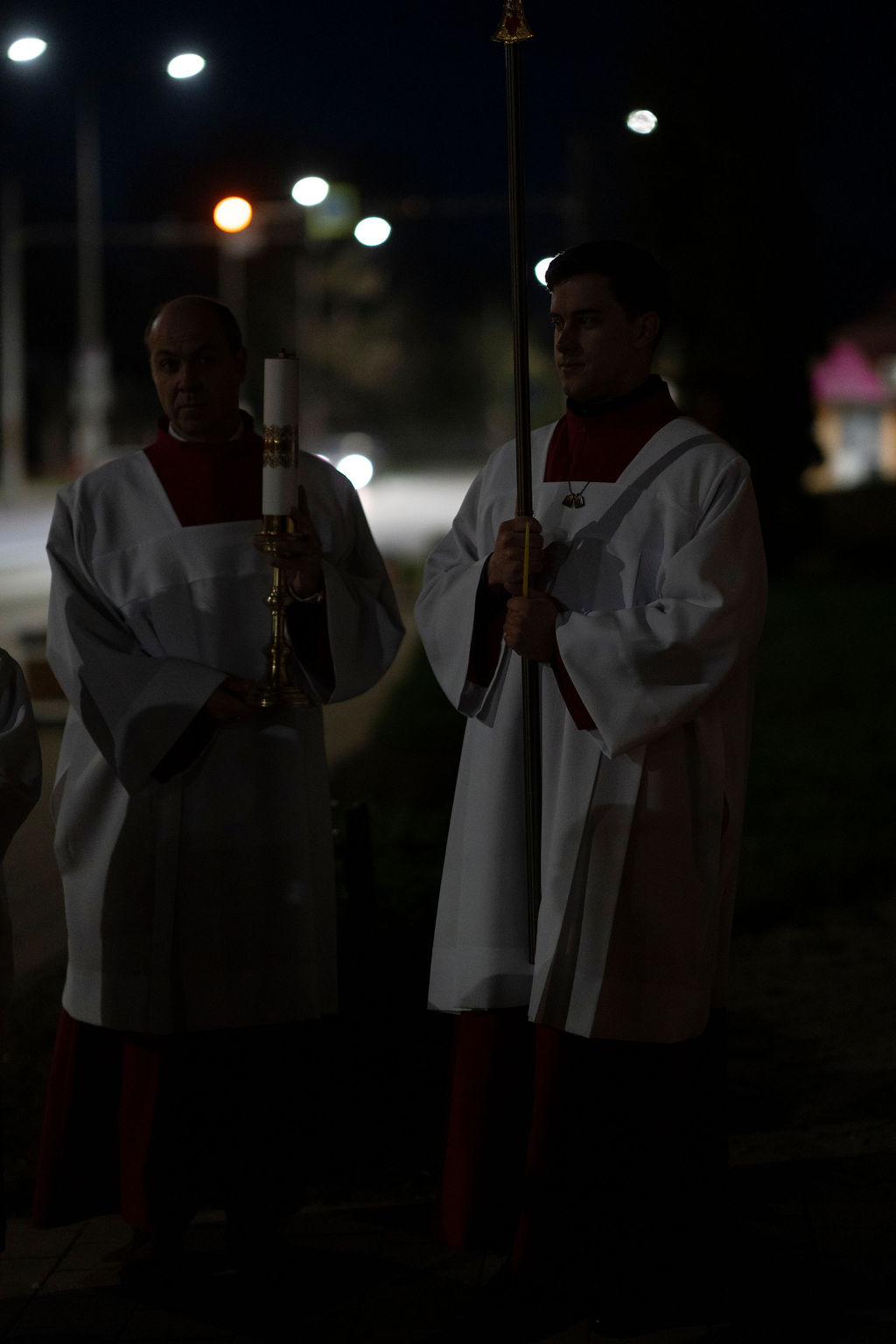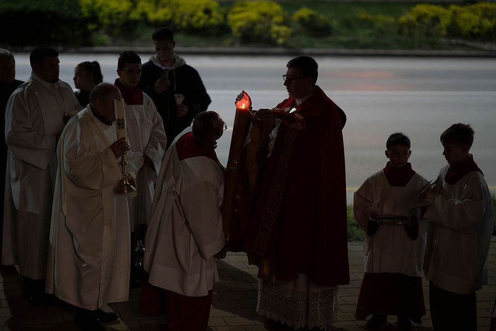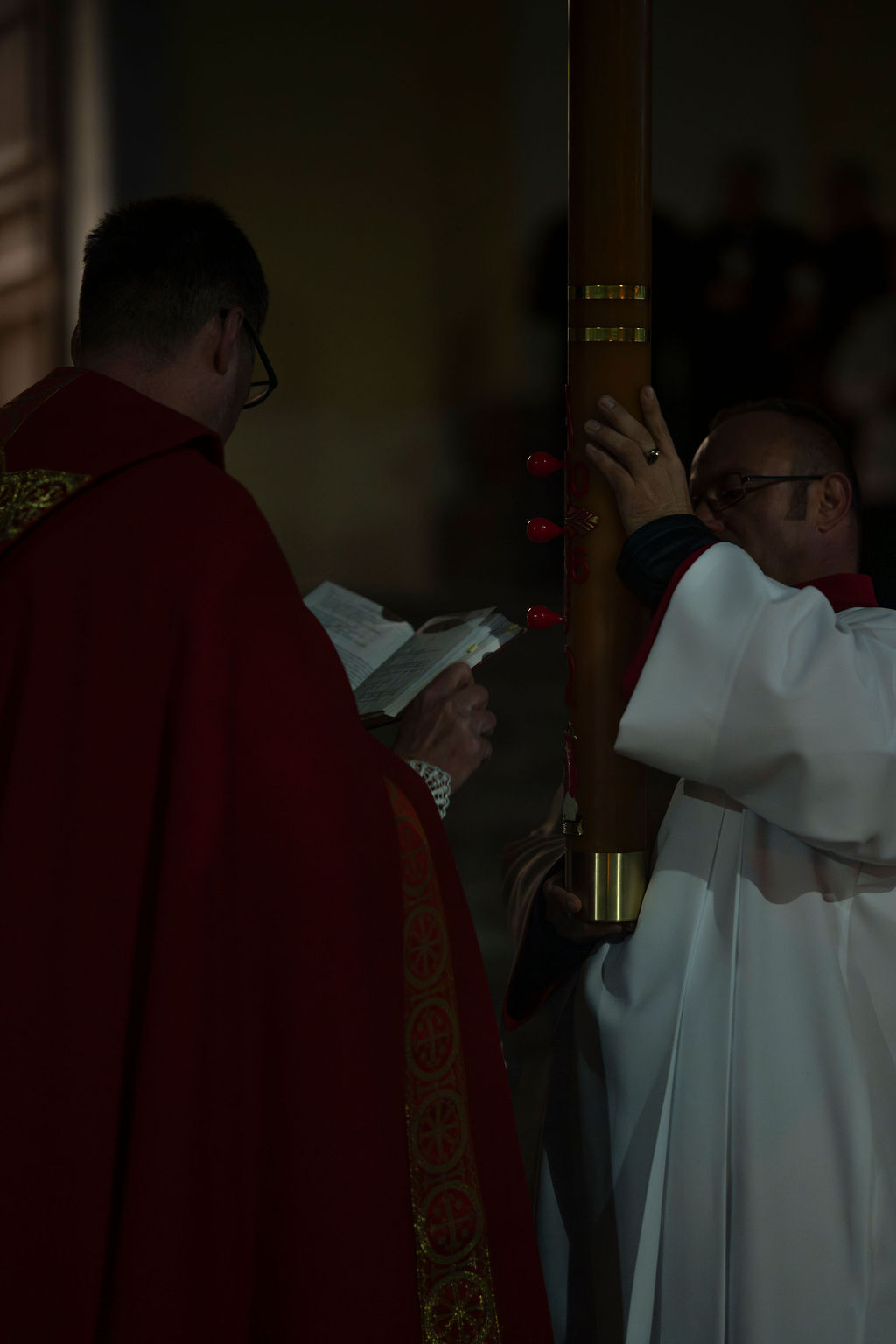 A szertartás a templomon kívül kezdődik az új tűz megszentelésével. A fény Krisztus jelképe, aki legyőzi a bűn és halál sötétségét (Jn 8,12). A megszentelt tűzről gyújtott húsvéti gyertya fénye fokozatosan tölti be a sötét templomot, miközben háromszor hangzik fel: „Krisztus világossága”. Ez a cselekmény nem puszta jelkép, hanem a feltámadás liturgikus megjelenítése, amely a sötétségből a világosságba való átmenetet fejezi ki.