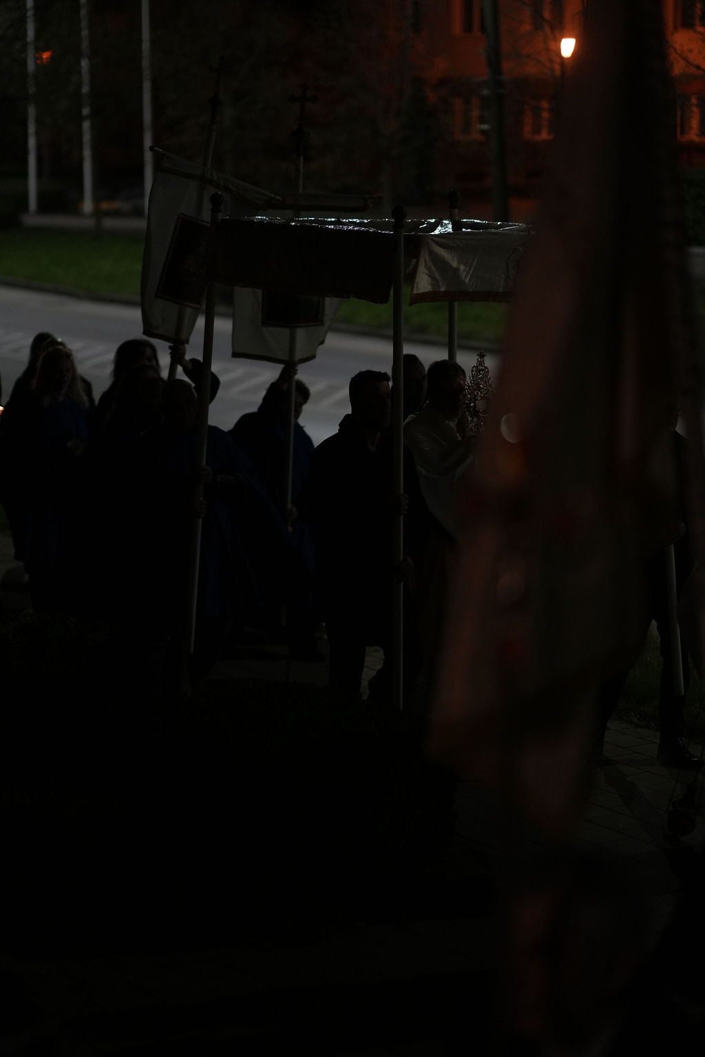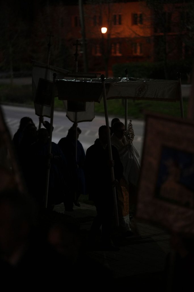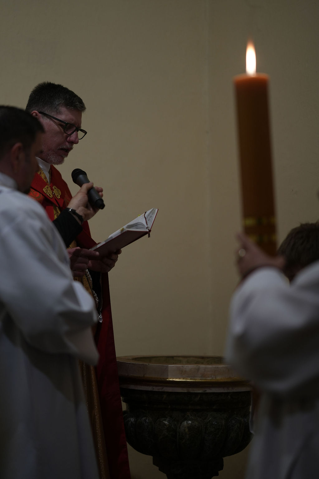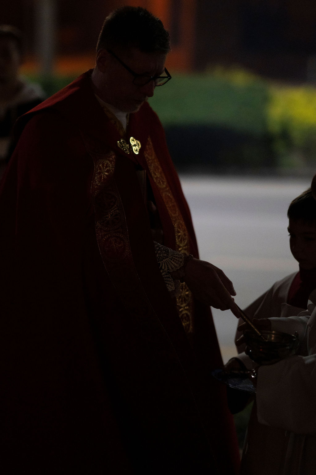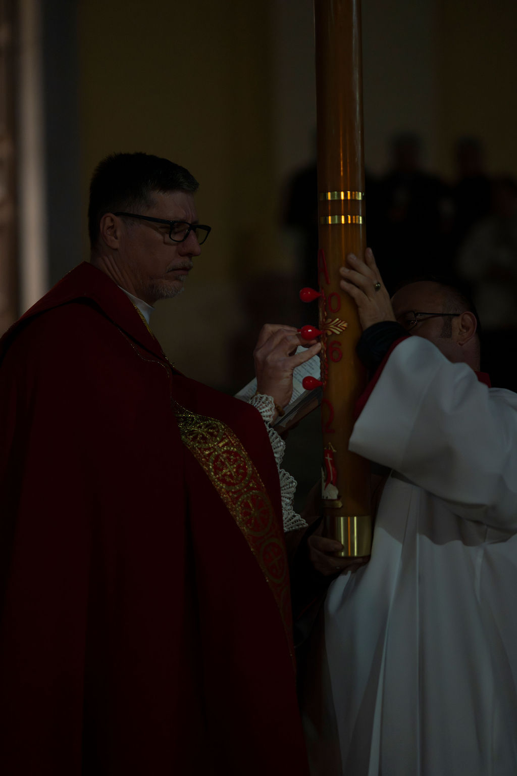 A szertartás a templomon kívül kezdődik az új tűz megszentelésével. A fény Krisztus jelképe, aki legyőzi a bűn és halál sötétségét (Jn 8,12). A megszentelt tűzről gyújtott húsvéti gyertya fénye fokozatosan tölti be a sötét templomot, miközben háromszor hangzik fel: „Krisztus világossága”. Ez a cselekmény nem puszta jelkép, hanem a feltámadás liturgikus megjelenítése, amely a sötétségből a világosságba való átmenetet fejezi ki.